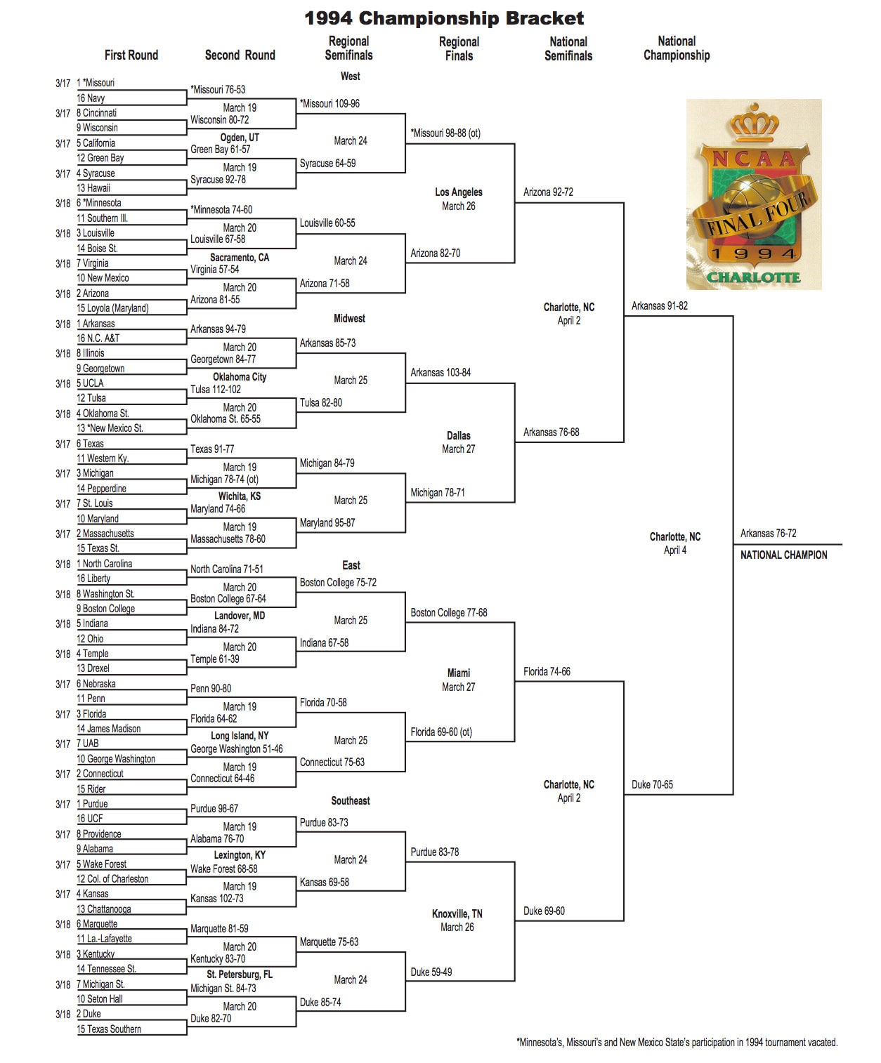 The 1994 NCAA tournament ended with Arkansas winning its first national championship. The Razorbacks beat Duke 76-72 in the final. Find the bracket, scores, stats and more below.
