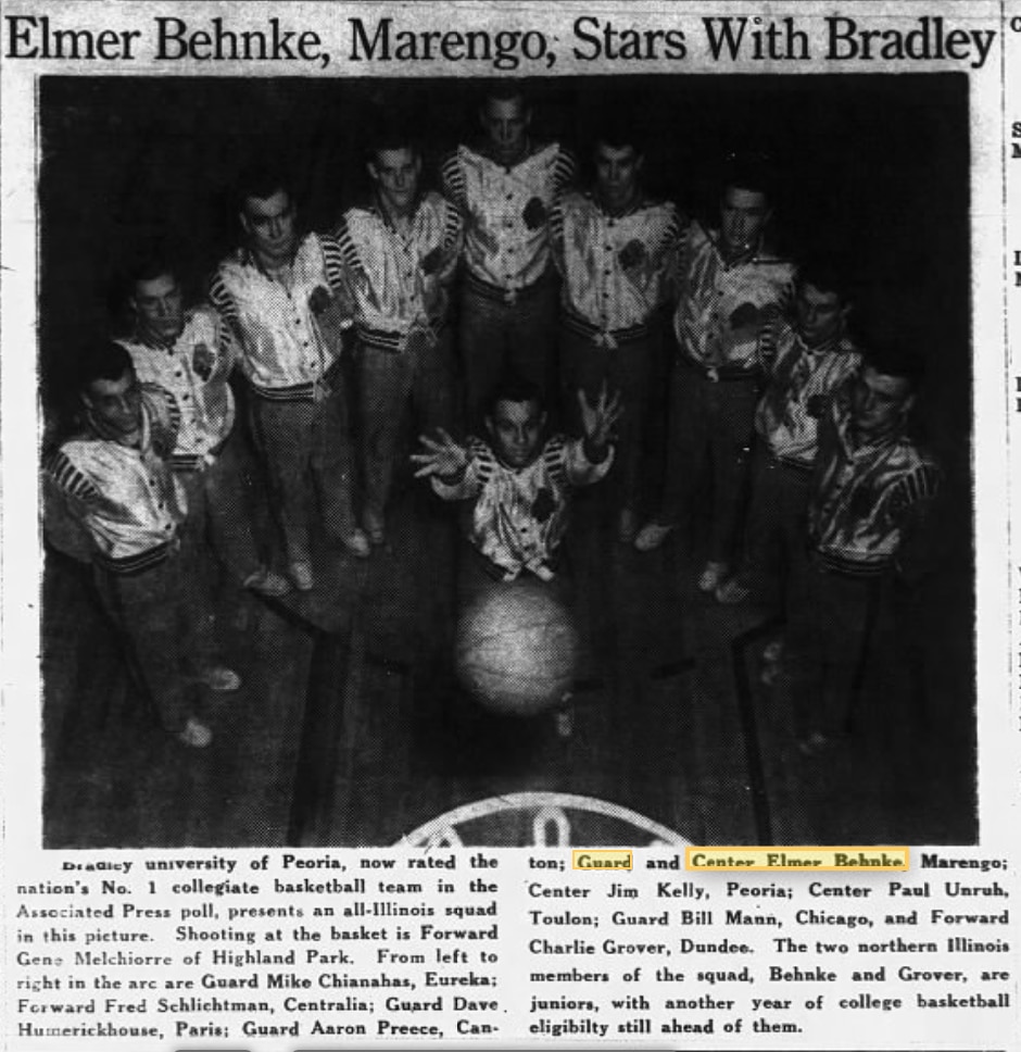As it turns out, according to the Marengo Republican-News, another Illinois-based newspaper, Behnke was listed as both a guard and a center, but not a forward. That's him in the middle of the picture below — the tallest player on the team.