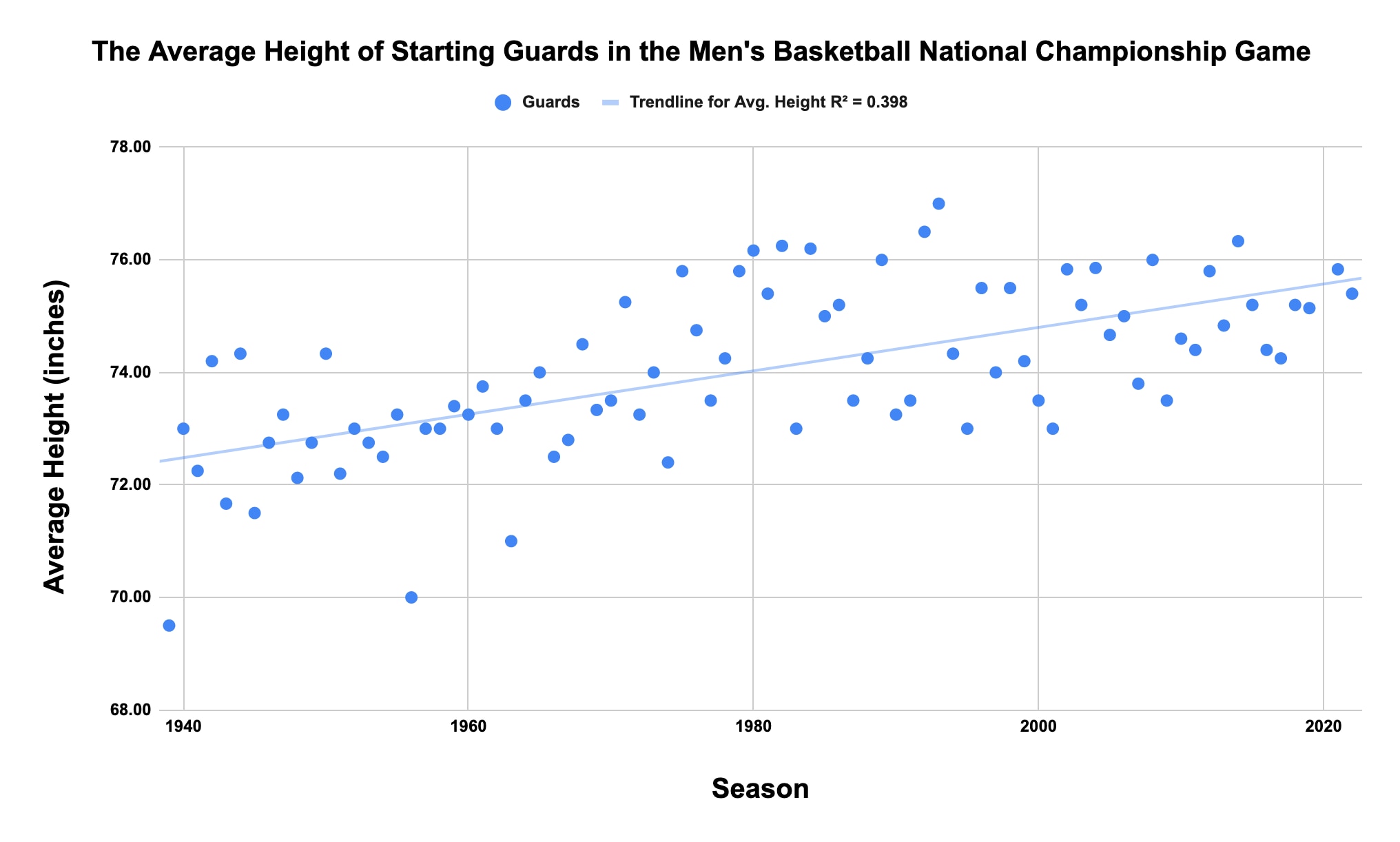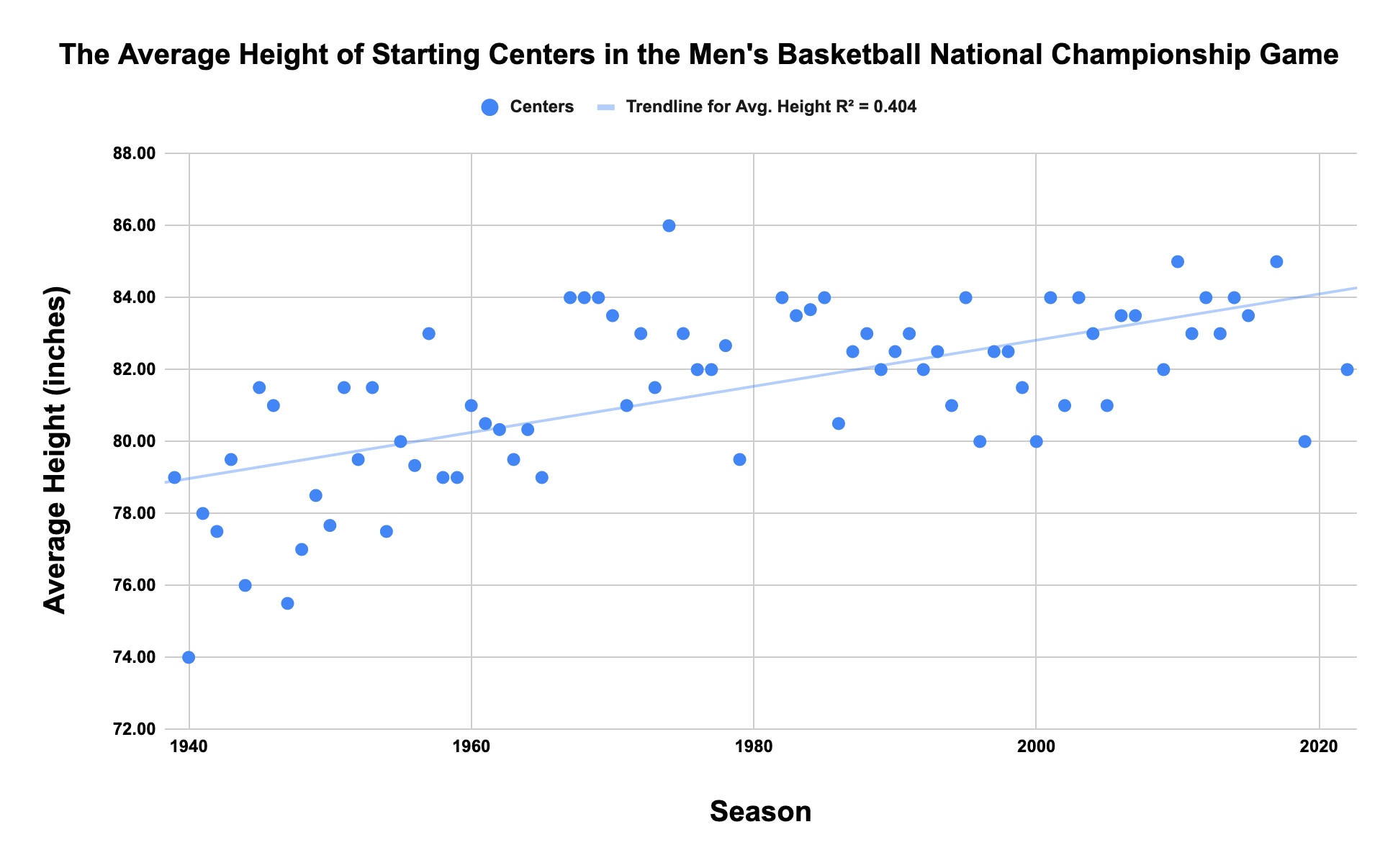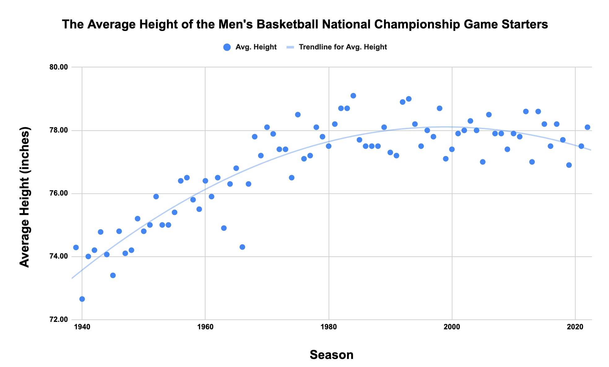 The scatter plot below shows the average height of the starters in every men's basketball national championship game, along with a polynomial trend line that shows the recent, slight downturn in average height. Note that data isn't available for every starter for the 1939, '43 and '44 title games.