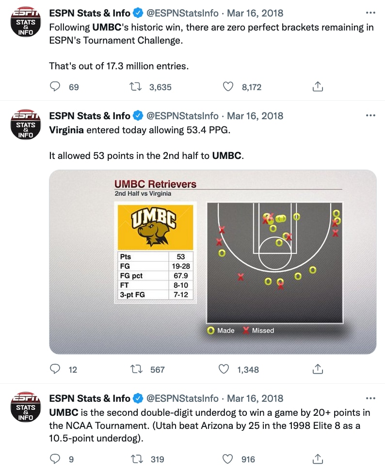In the official Bracket Challenge Game, 2.18 percent of entries correctly picked UMBC to beat Virginia, which was picked to win the national championship by 13.73 percent of entrants. That means that, roughly, two out of every 15 participants in the Bracket Challenge Game essentially had no chance of winning their respective bracket pools before the first round of the tournament was even over.