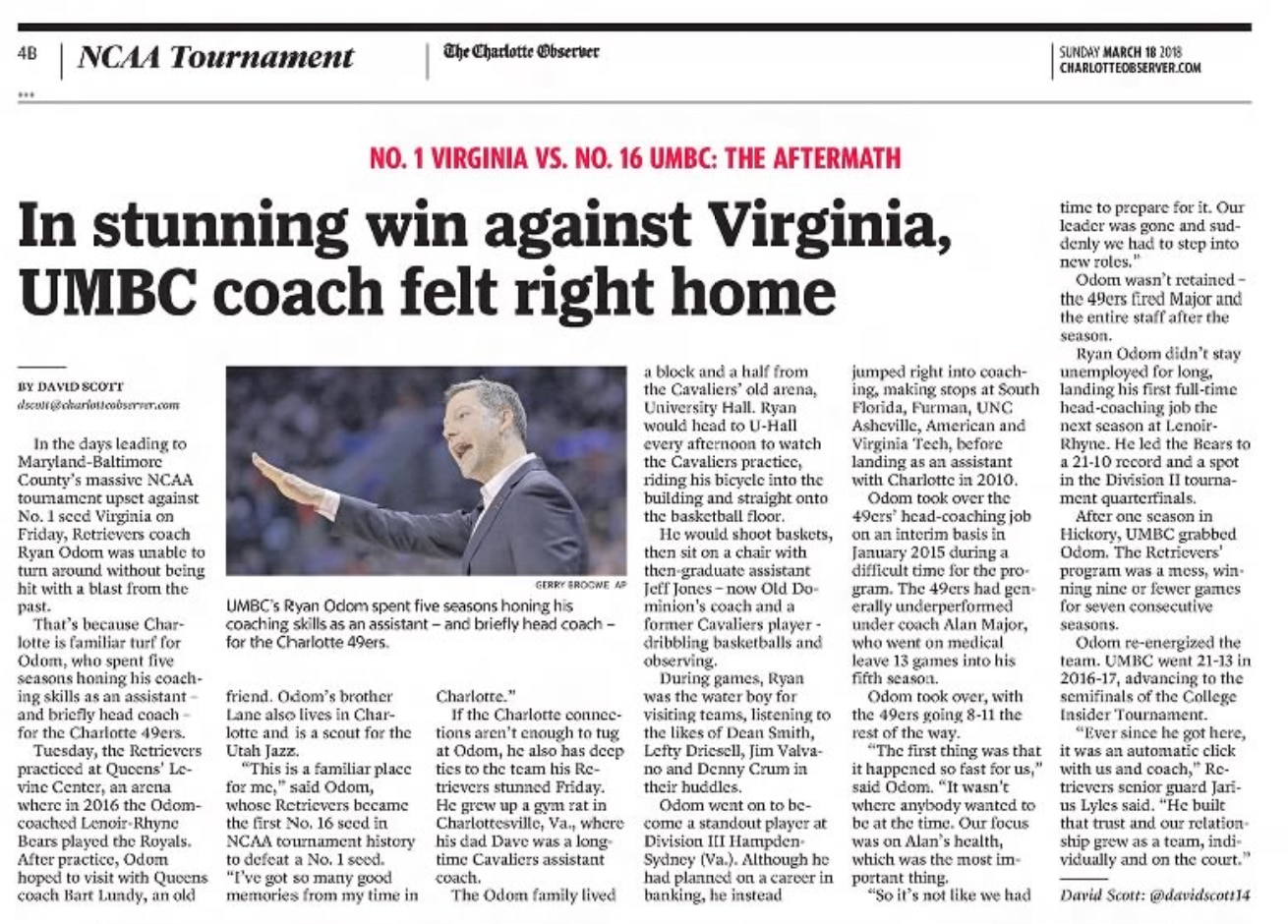 When the ball was tipped, UMBC point guard K.J. Maura, a senior listed at 5-foot-8 and 140 pounds who personified the underdog spirit of the Retrievers, stood on the far right edge of the March Madness logo at midcourt, with his left foot on the final "S" in "Madness." With the game being played in Charlotte, the announcing team made several comparisons to Muggsy Bogues, the 5-foot-3 former NBA player who spent a decade with the Hornets.