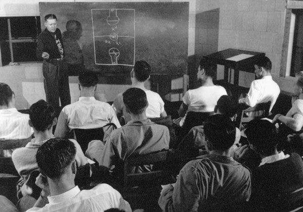Oklahoma State's Henry Iba gives a chalk talk to his 1946 NCAA Champions.
