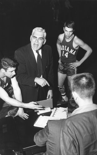 Indiana coach Branch McCracken argues with the scorer over the amount of fouls on Kansas center B.H. Born during the title game held in Kansas City, MO. at the Municipal Auditorium. Indiana defeated Kansas 69-68 to win the title.