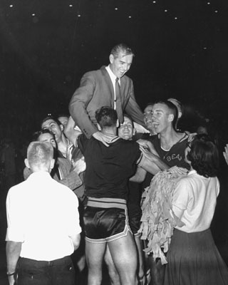California coach Pete Newell rides on the shoulders of this team after defeating West Virginia 71-70.