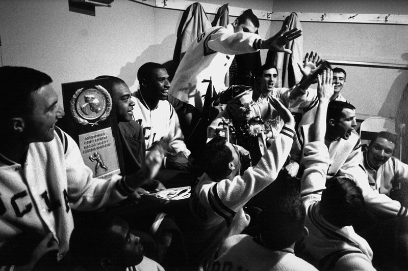 UCLA coach John Wooden and his championship team after winning their first NCAA basketball title.