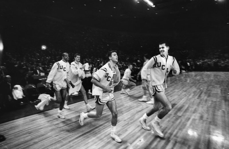UCLA's Gail Goodrich (center) and teammates run on to the court after the victory.