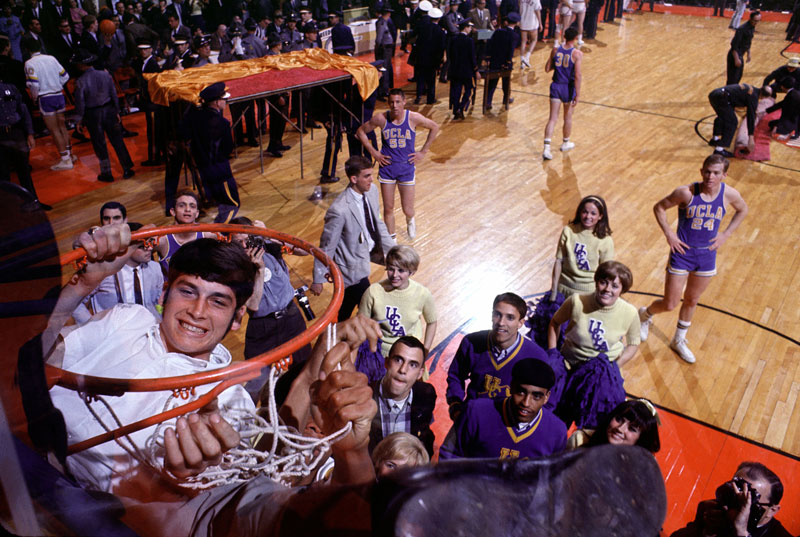 A UCLA team member tears down the net following UCLA defeating Dayton 79-64 for the national title.