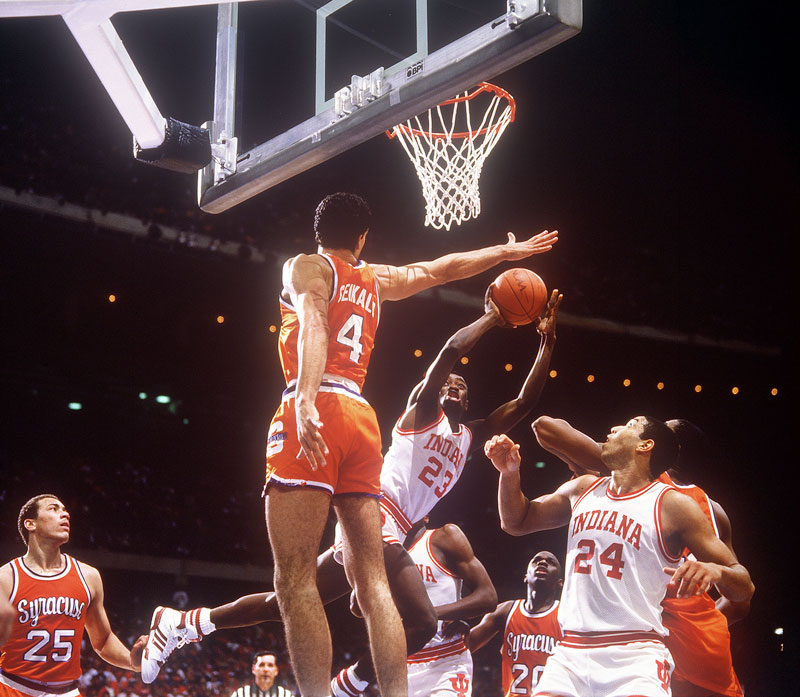Keith Smart (23) of Indiana puts up a shot past Rony Seikaly (4) of Syracuse.