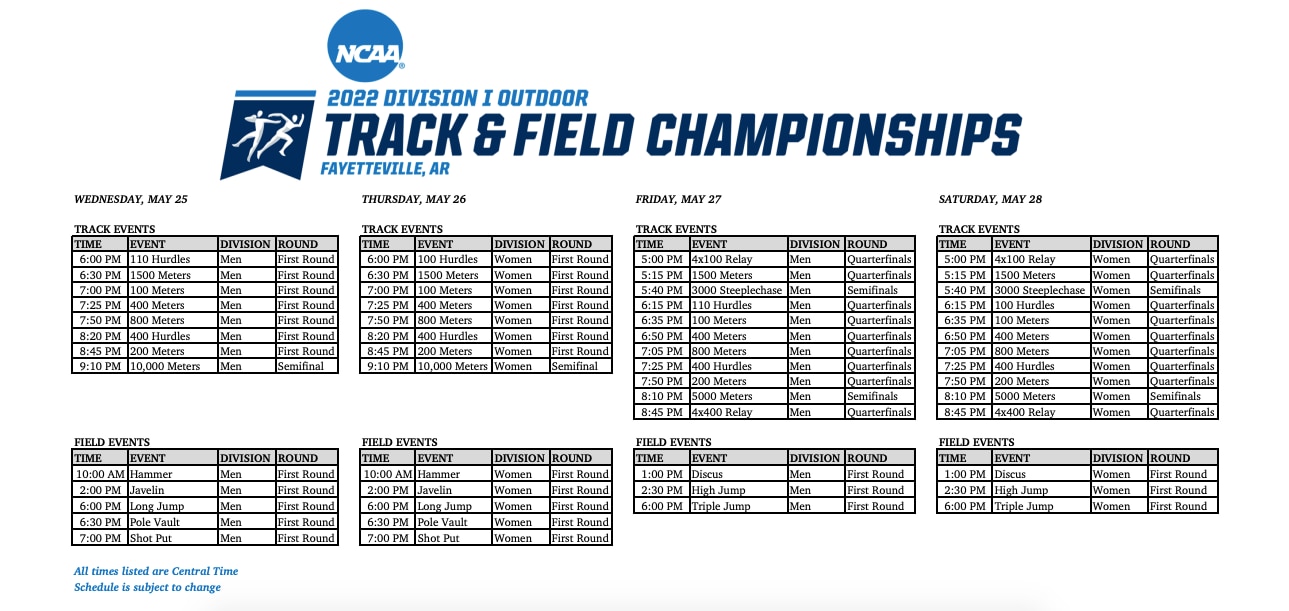 The NCAA announced the 2022 NCAA DI Outdoor Track & Field Championships schedule of events on Jan. 31, 2022. Below are some of the notable dates and times for events: