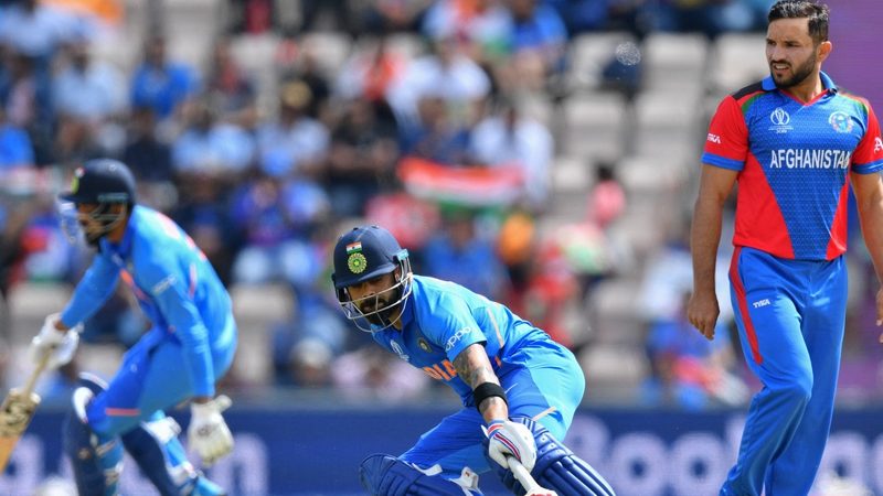 With the required run rate at 10.55, Afghanistan get off the mark with five runs off the first over bowled by India's Mohammed Shami,