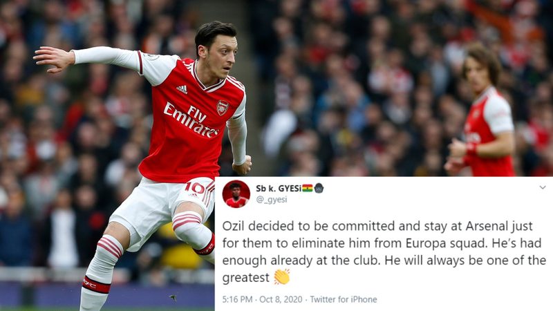 Arsenal midfielder Mesut Ozil has been left out of the club's Europa League squad of the 2020/21 season, causing a massive uproar amongst the supporters on Twitter.