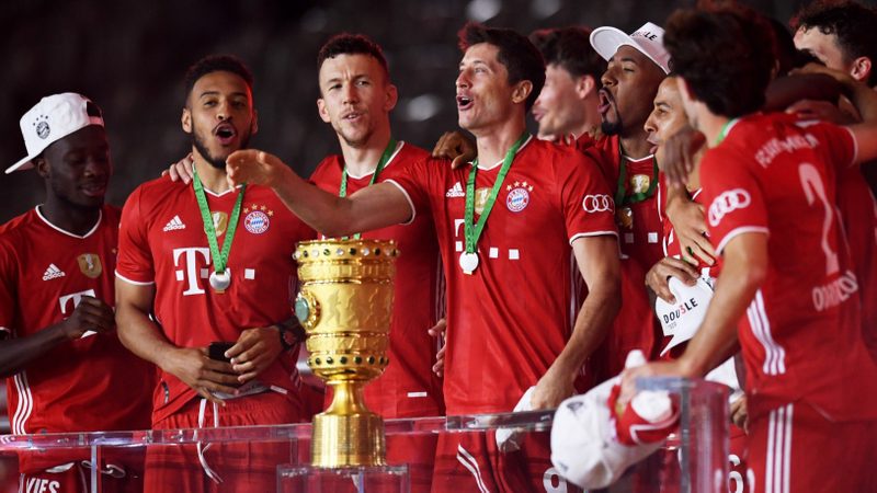 Robert Lewandowski passed the 50-goal mark this season as Bayern Munich completed the double with a 4-2 victory over Bayer Leverkusen behind closed doors to win a 20th German Cup on Saturday.