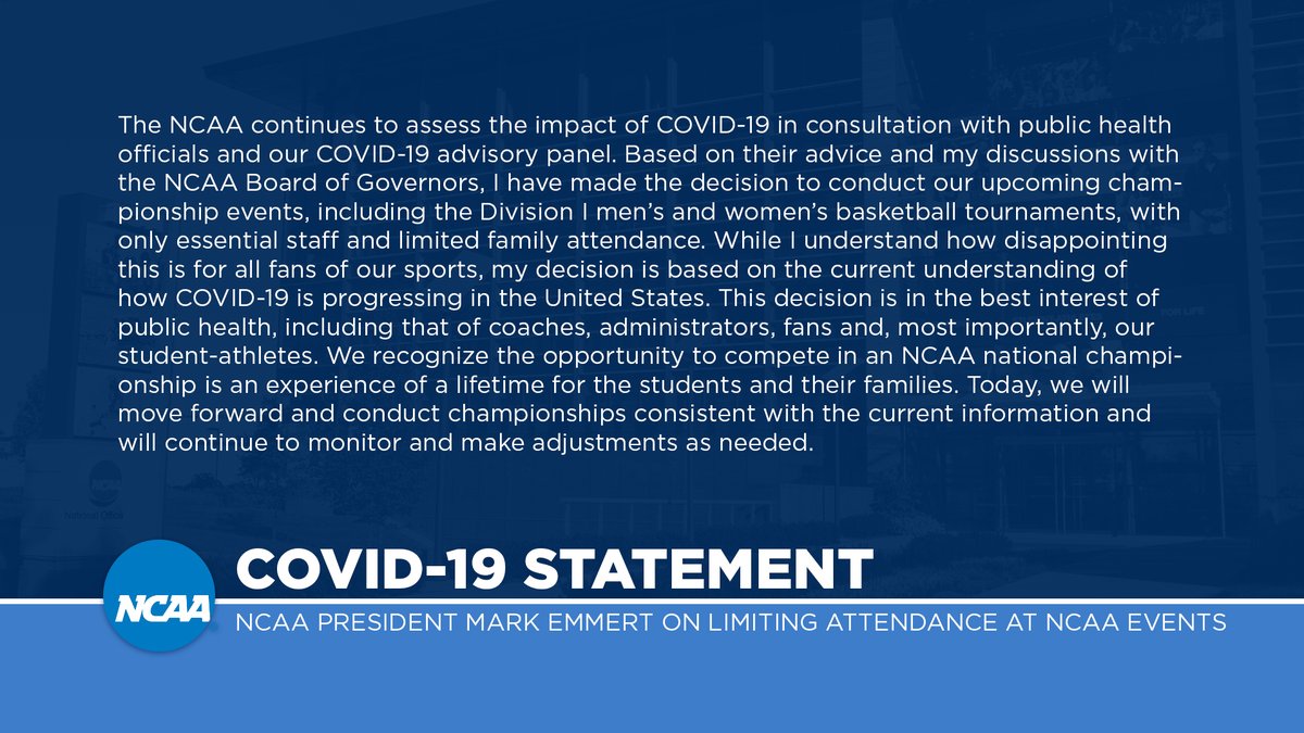 "The world is experiencing a challenging health crisis with the coronavirus pandemic. It is an unsettling and concerning time in our history. For those of us who love and treasure college basketball, it has resulted in the cancellation of NCAA basketball championships and an empty month that otherwise would be filled with tremendous excitement. The disappointment and heartbreak we all feel for student-athletes unable to compete is significant, yet nothing is ever more important than the health and safety of student-athletes, coaches and fans.