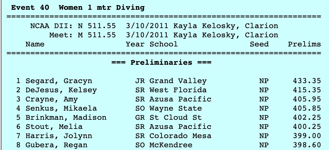 Welcome to the final day of action from the 2022 Division II swimming and diving championships. Action picks up at 10 am ET from Greensboro, North Carolina. Once again, the early session will feature preliminaries while the late session will have the finals for the earlier preliminary races and dives.