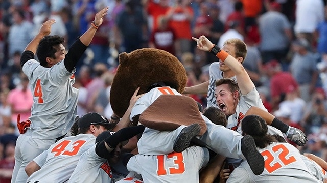 Why we love it: Benny Beaver, Oregon State's mascot, somehow found his way to the top of the iconic dog pile after the final out. This beaver got hops.