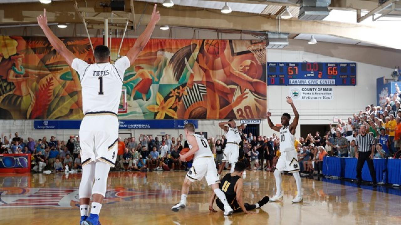 He sank the second one cleanly and Wichita State fumbled away its final possession, sending Notre Dame to its first Maui title in three trips.