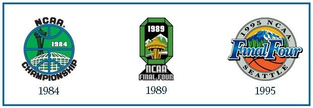 For my tastes, Seattle has the best logo set of any multiple-time Final Four host. In all three, there's an emphasis on classically northwest colors: before the deep, muted evergreen became modern touchstones, emerald and blue (like the Seattle Seahawks' 1990s uniforms) were the region's guiding tones.