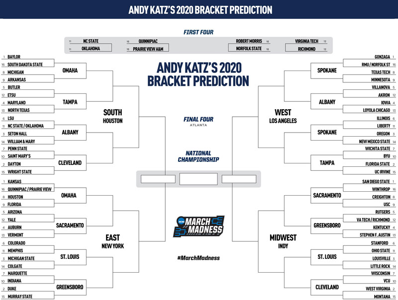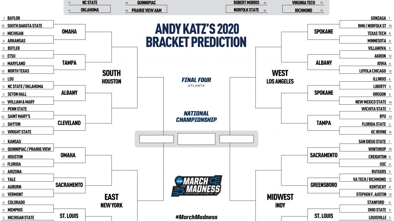 In Katz's previous predicted bracket on Jan. 14, Duke, Butler and Gonzaga joined Baylor as No. 1 seeds. Katz had earlier made a preseason bracket in September (50 days before opening night last fall), and also one in early December (roughly 100 days from Selection Sunday).