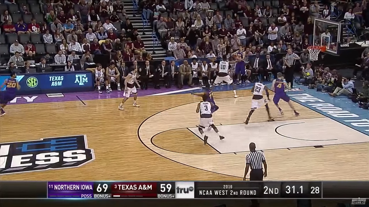 After Jones' dunk, Lohaus was unable in inbound the ball, committing a turnover and giving the ball back to Texas A&M, under Northern Iowa's basket. For the third offensive possession in a row, the Aggies would start their offensive possession on that end of the floor, each of which added up to significant savings in terms of the time left on the clock.