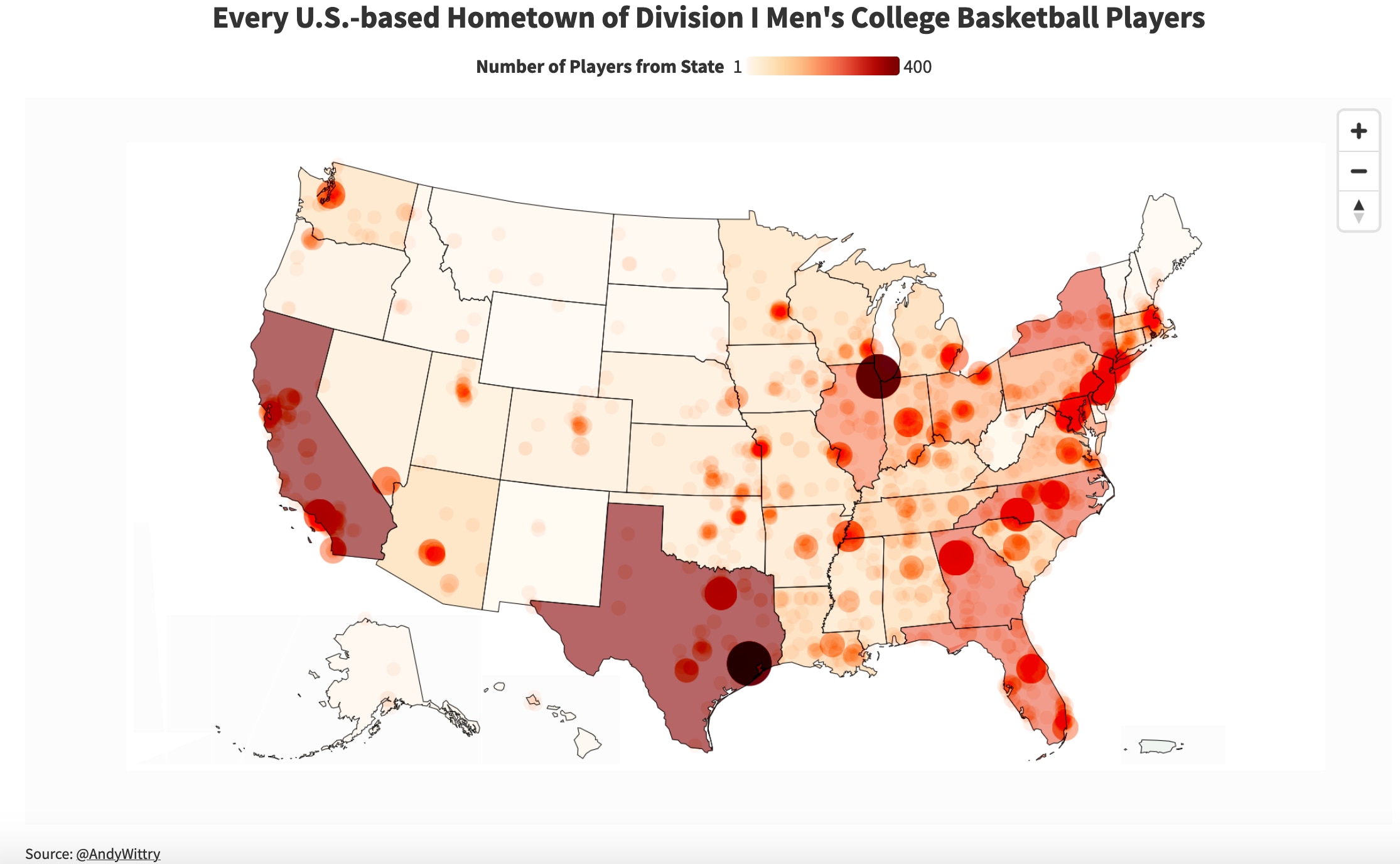 Below is a world map with the hometown of every current DI men's basketball player. .