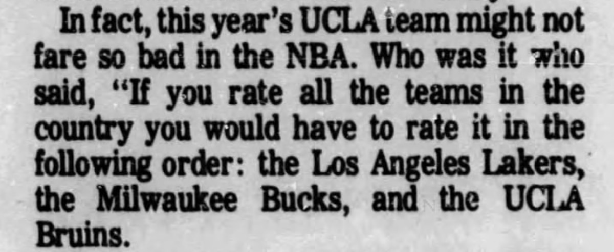 unattributed (1972): "If you rate all the teams in the country you would have to rate it in the following order: the Los Angeles Lakers, the Milwaukee Bucks, and the UCLA Bruins."