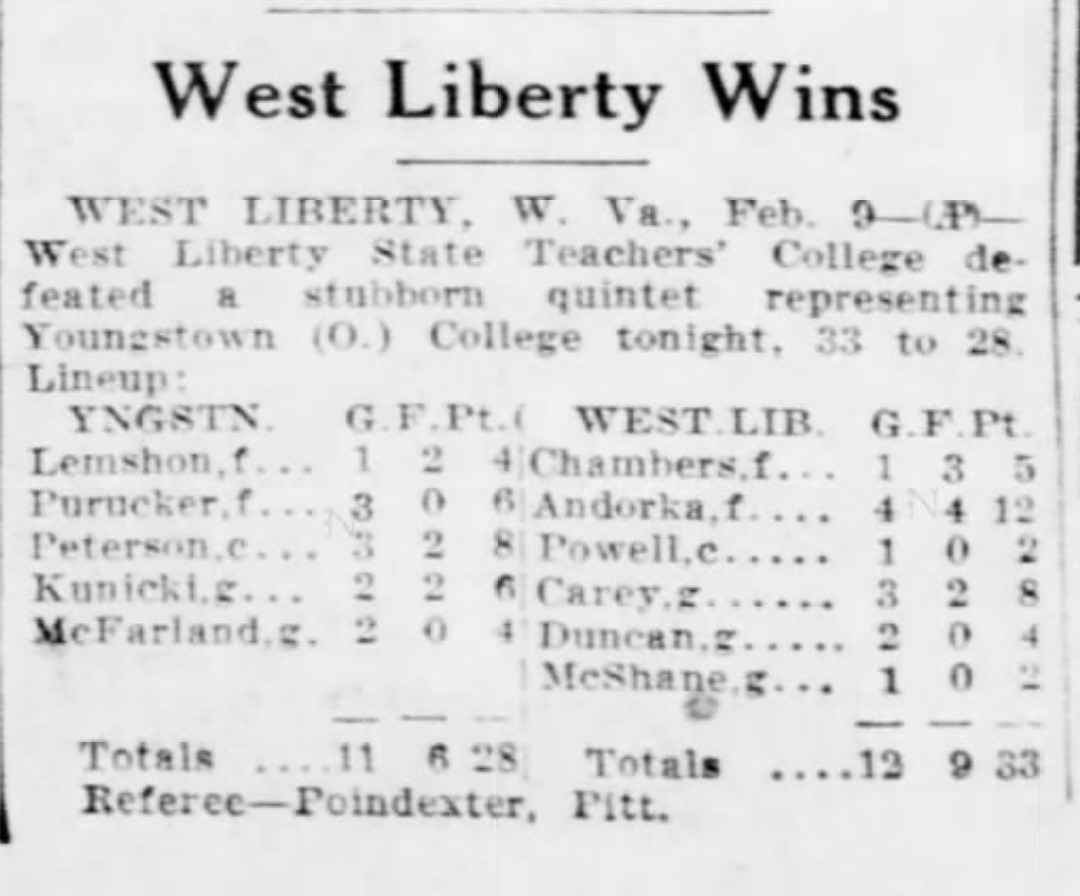 The following AP recap was published in the Pittsburgh Post-Gazette after West Liberty State's 33-28 win in Feb. 1933.