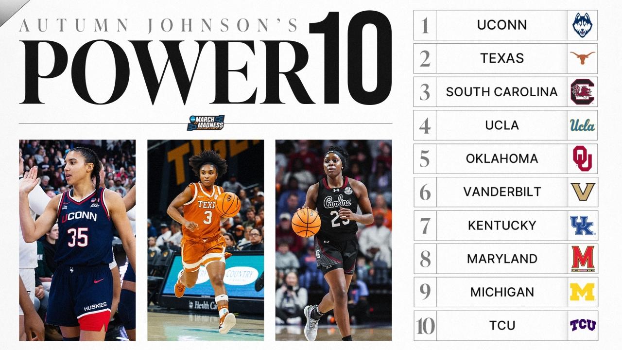 The top four remain in tact, but we have some serious shakeups down the ladder with a pair of SEC teams breaching the rankings for the first time this season. Here are the latest women's basketball Power 10 rankings: