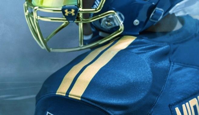 If the saying "Look good, feel good, play good" carries any weight, Navy might play its best game of the season on Dec. 9, when the Midshipmen take on Army in their annual rivalry game. That's because on Monday Navy unveiled its Blue Angels-inspired uniforms for the game, which feature two gold stripes down the shoulders, gold lettering and numbers, and a gold facemask on a navy blue jersey and helmet.
