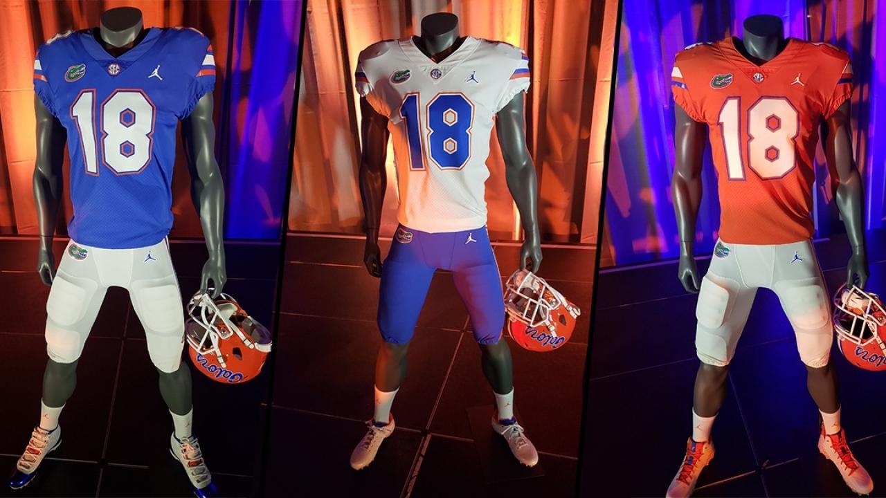Three new kits were displayed during a Florida rally that was open to fans and media at Atlanta's World Congress Center Tuesday night — home blues, away whites and orange alternates. The Gators became the fourth college football program to switch over to Jordan Brand, and the partnership will extend toward the school's men's and women's basketball programs as well.