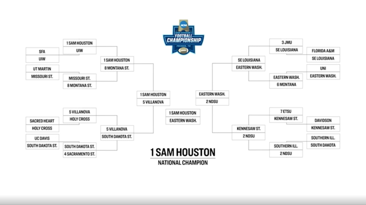 Sam Houston will use its home-field advantage to win a semifinal game against Villanova. Sam Houston's talent across the board will overwhelm the Wildcats, carrying Sam Houston to victory. It will be a nice run for Villanova, making it this deep in the playoffs, and the road still ends in Texas; it just won’t be in Frisco.
