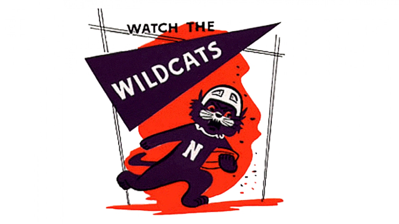 Another logo that dates itself in a good way. The leather helmet, the strangely oblong football, and a call to action: Watch the Wildcats! Do it!