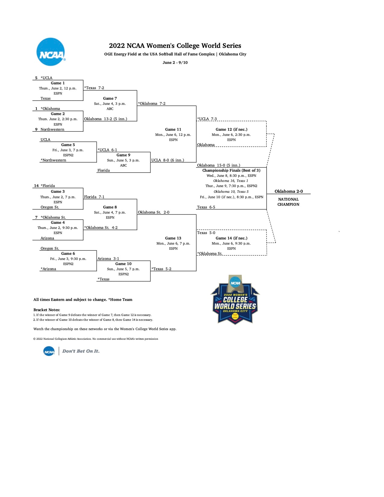 Next, here's the 2022 WCWS bracket.