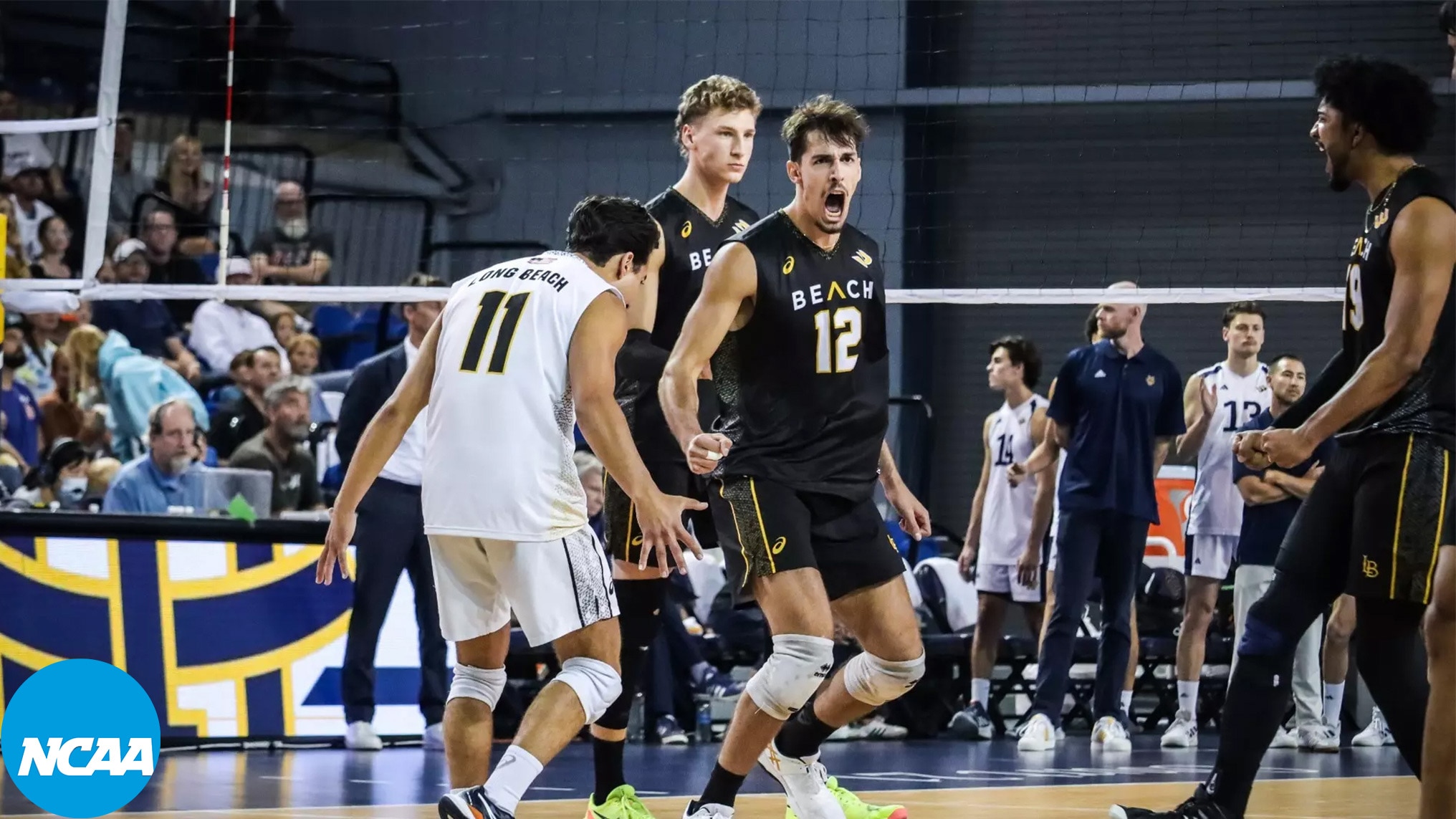 NC Men's College Volleyball - Home NC Men's Volleyball Long Beach State sweeps UCLA to win program's 4th national title NC Men's Volleyball UCLA and Ohio State men's volleyball combine for an NCAA record 94 points in a set NC Men's Volleyball Long Beach State vs. UCLA: 2025 NCAA men's volleyball championship highlights NC Men's Volleyball Long Beach State wins the 2025 men's volleyball championship NC men's volleyball championship May 9-11, 2026 Pauley Pavilion | Los Angeles, CA Champ history Championship Highlights NC Men's Volleyball 2025 — Long Beach State 3, UCLA 0 NC Men's Volleyball 2024 — UCLA 3, Long Beach State 1 NC Men's Volleyball 2023 — UCLA 3, Hawaii 1 NC Men's Volleyball 2022 — Hawaii 3, Long Beach State 0 NC Men's Volleyball 2021 Hawaii 3, BYU 0 NC Men's Volleyball 2019 — Long Beach State 3, Hawaii 1 NC Men's Volleyball 2018 — Long Beach State 3, UCLA 2 Explore More Follow men's volleyball Championship Recaps 🦈 Long Beach State wins 2025 🐻 UCLA wins 2024 🐻 UCLA wins 2023 🌈 Hawaii wins 2022 🌈 Hawaii wins 2021 🦈 Long Beach State wins 2019 🦈 Long Beach State wins 2018